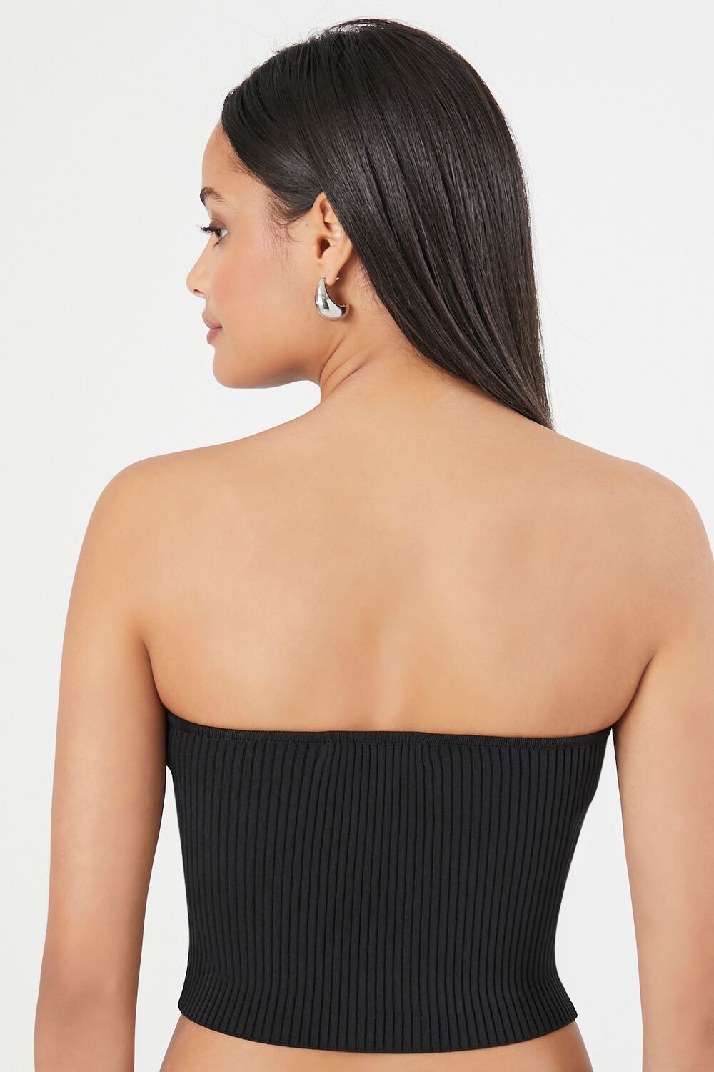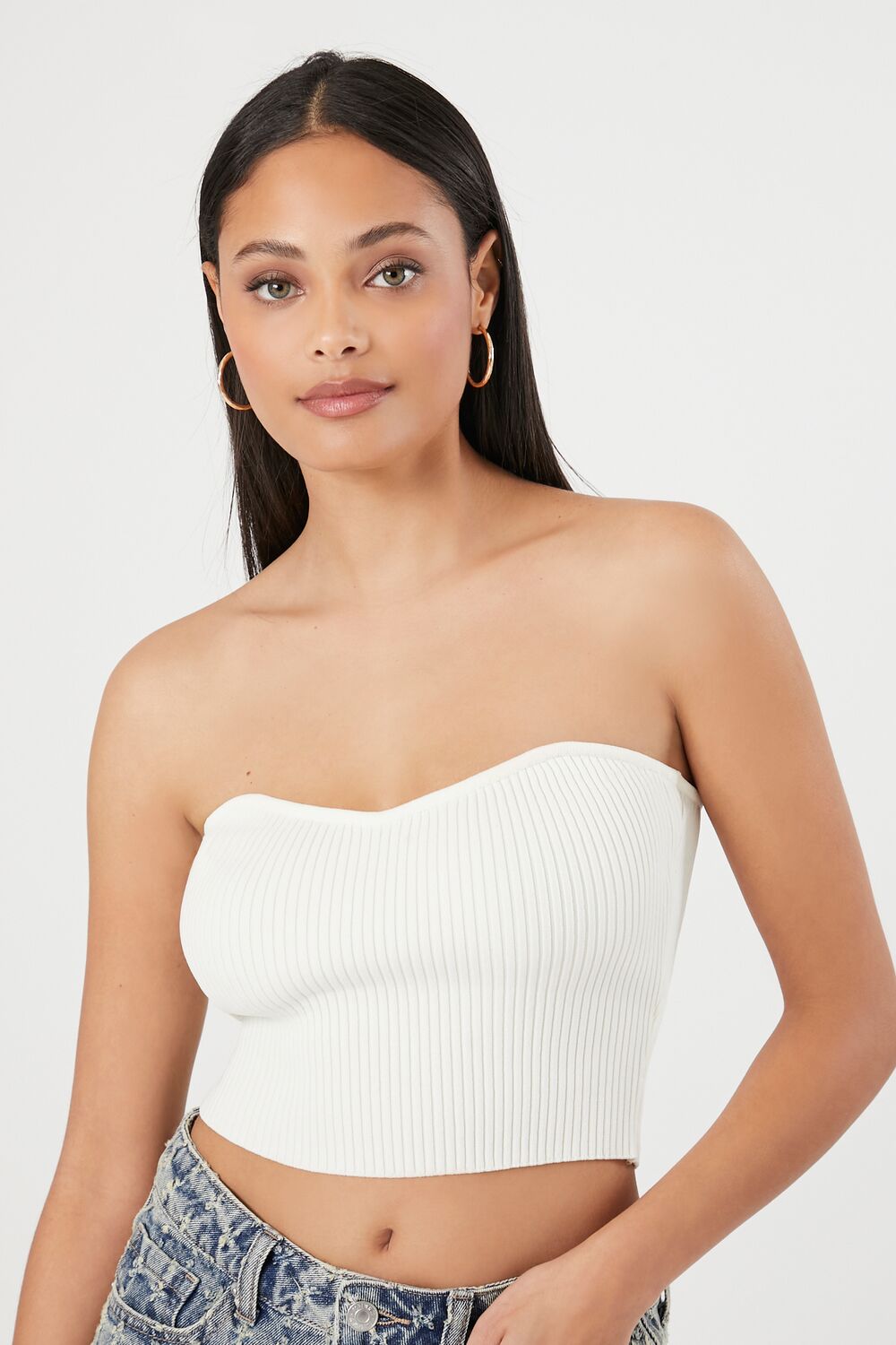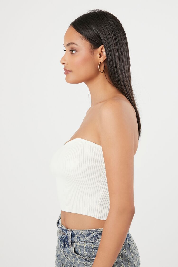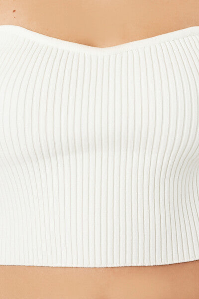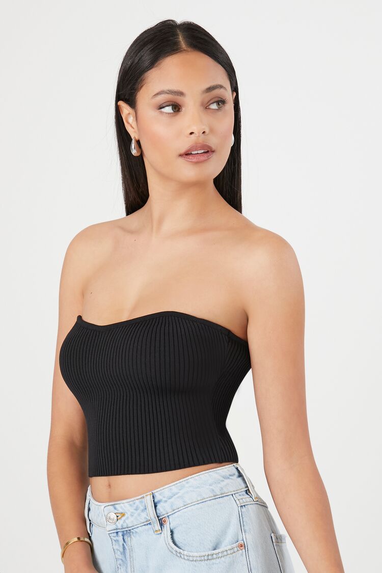 A sweater-knit tube top featuring an allover ribbed construction. sweetheart neckline. straight-cut back. and a cropped hem.