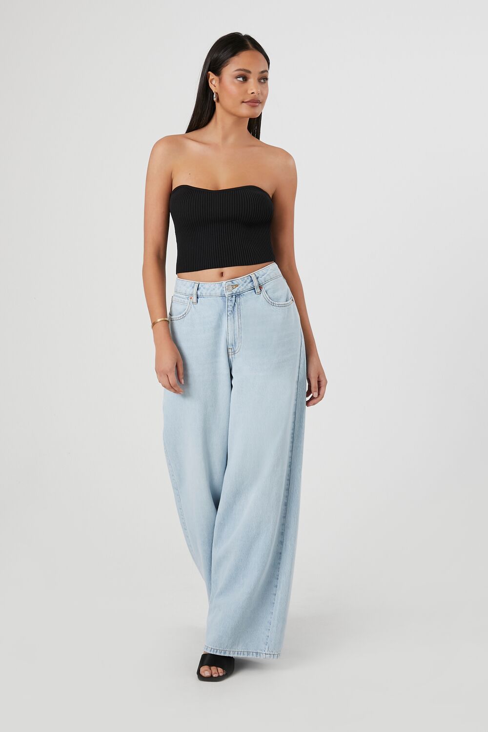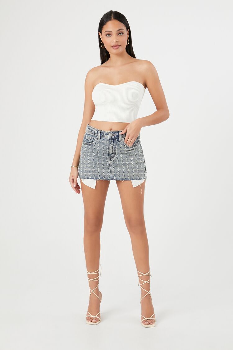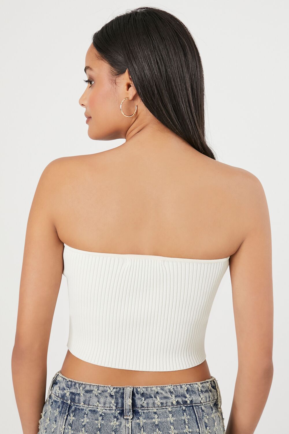 A sweater-knit tube top featuring an allover ribbed construction. sweetheart neckline. straight-cut back. and a cropped hem.