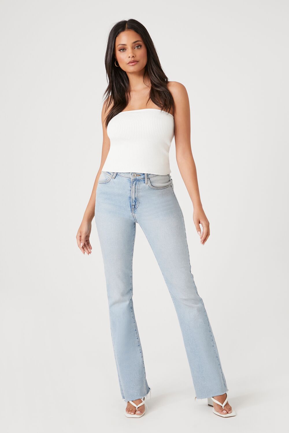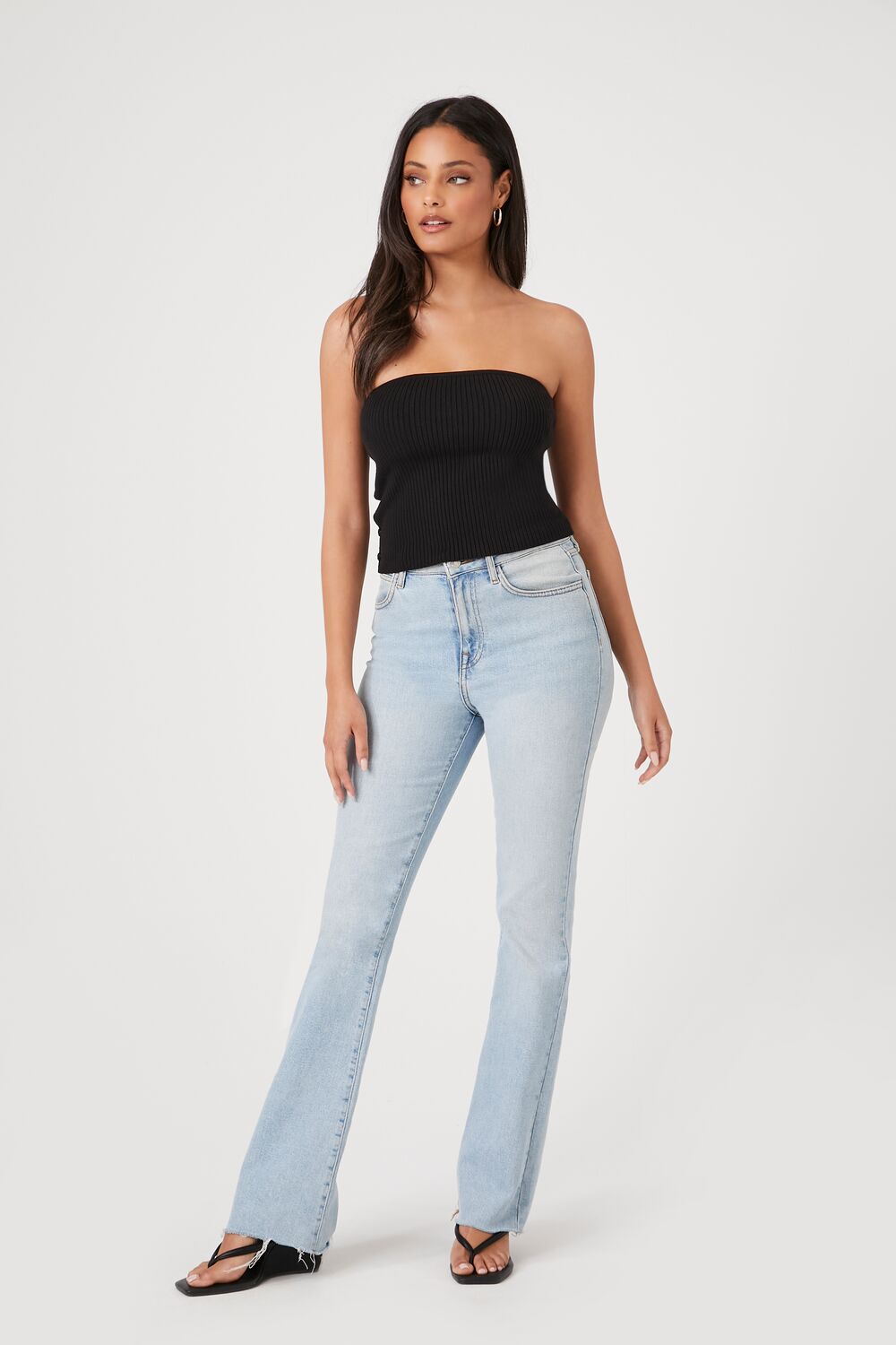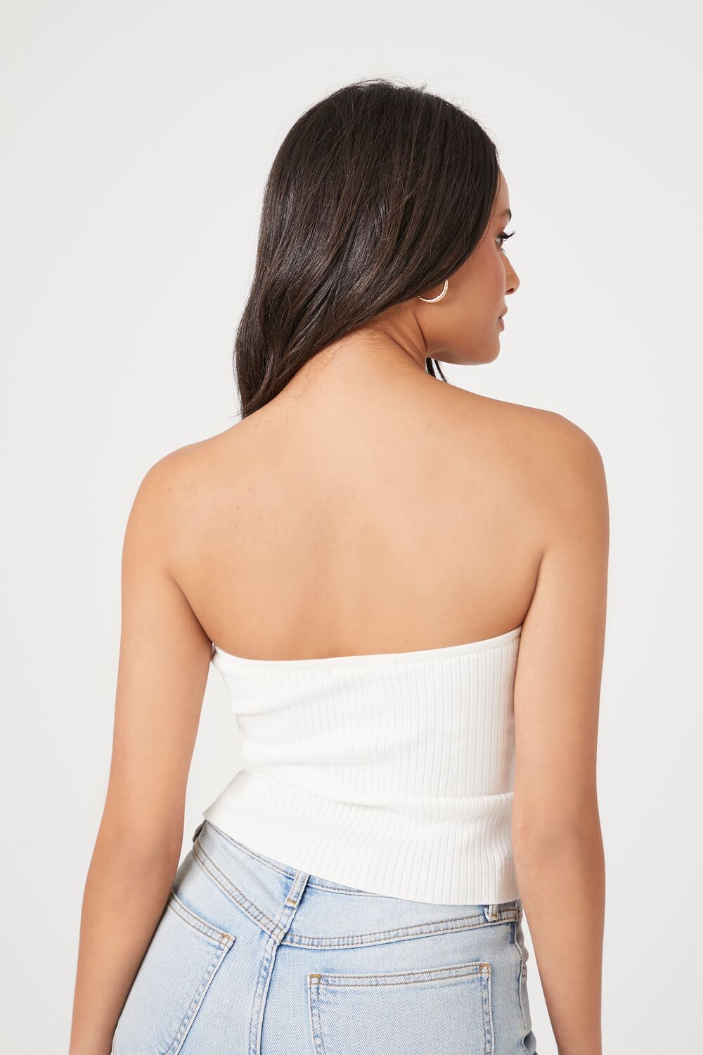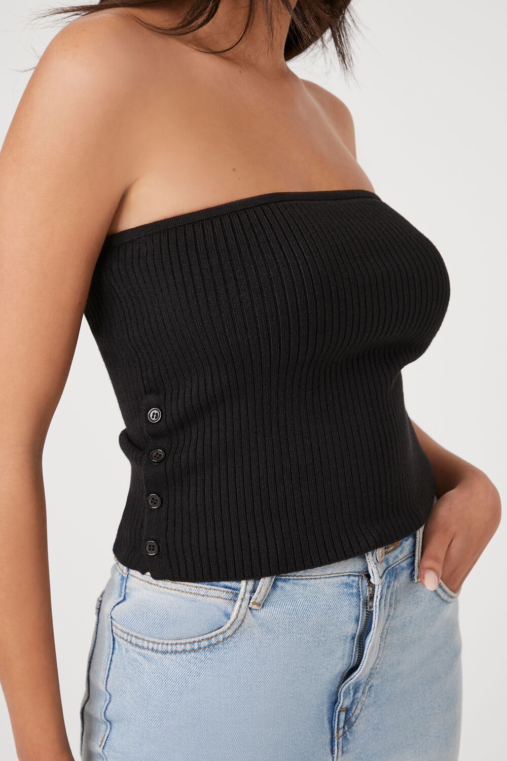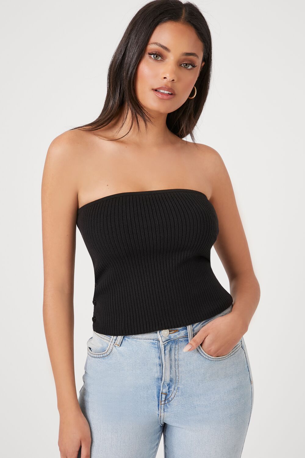 A sweater-knit tube top featuring an allover ribbed construction. side buttons. and a straight-cut neckline and back.