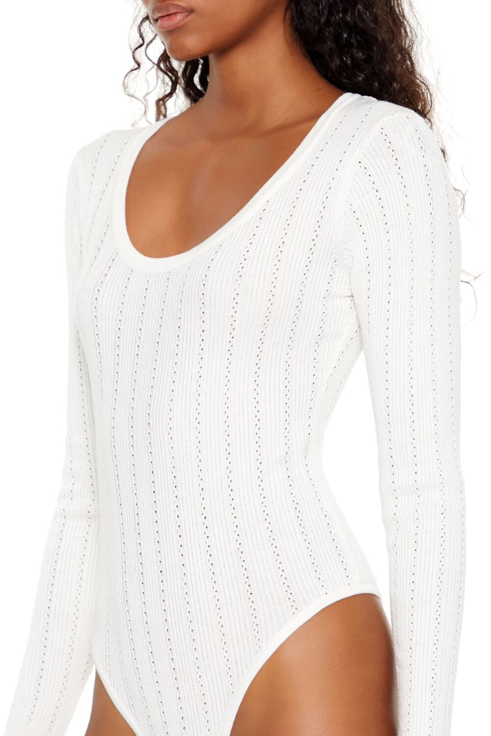 A sweater-knit bodysuit featuring a scoop neck. long sleeves. and thong cut.