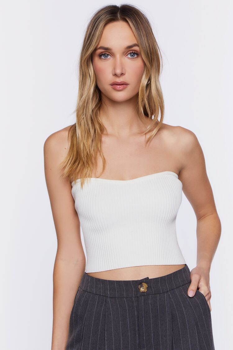 A sweater-knit tube top featuring a sweetheart neckline. straight cut back. and cropped hem.