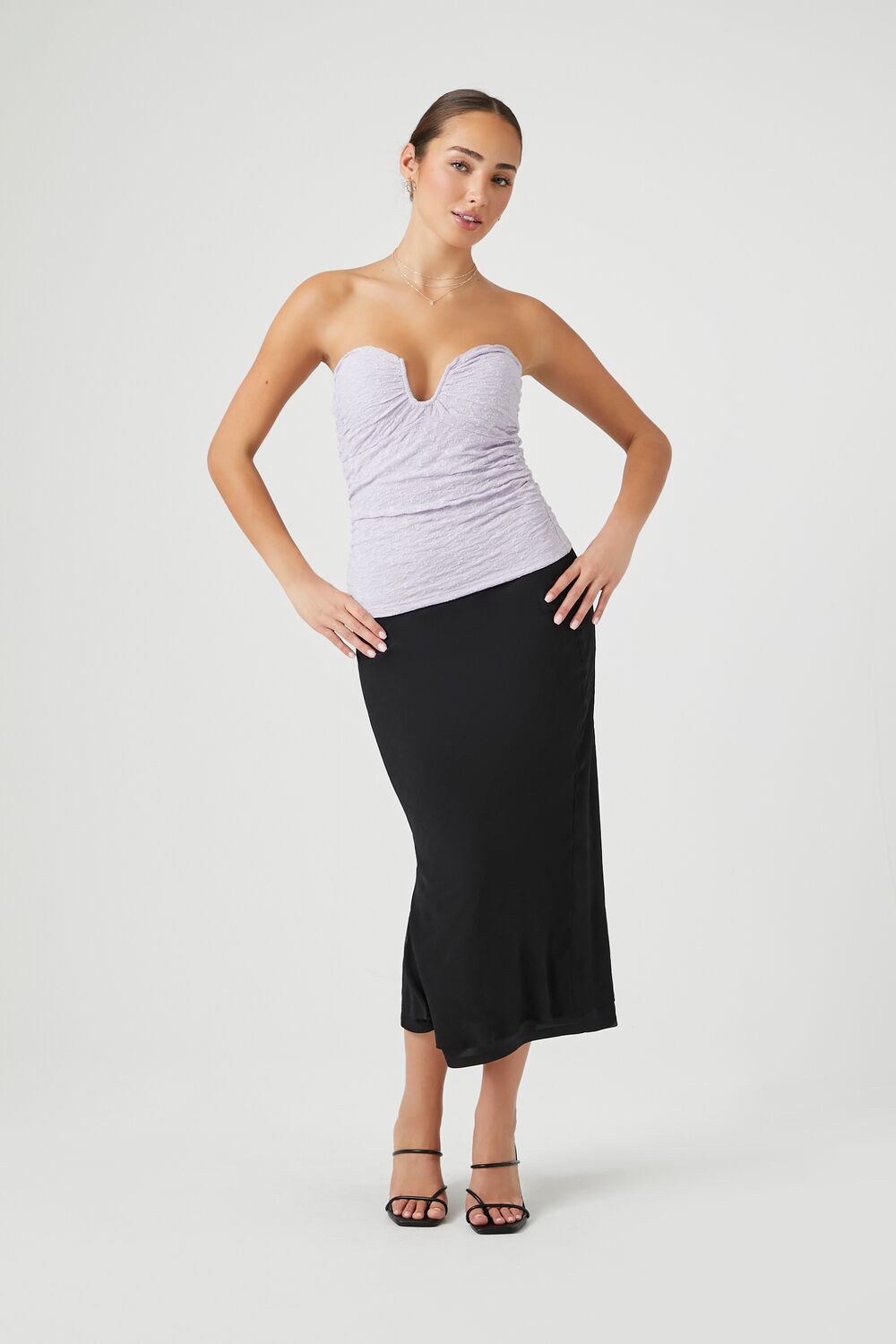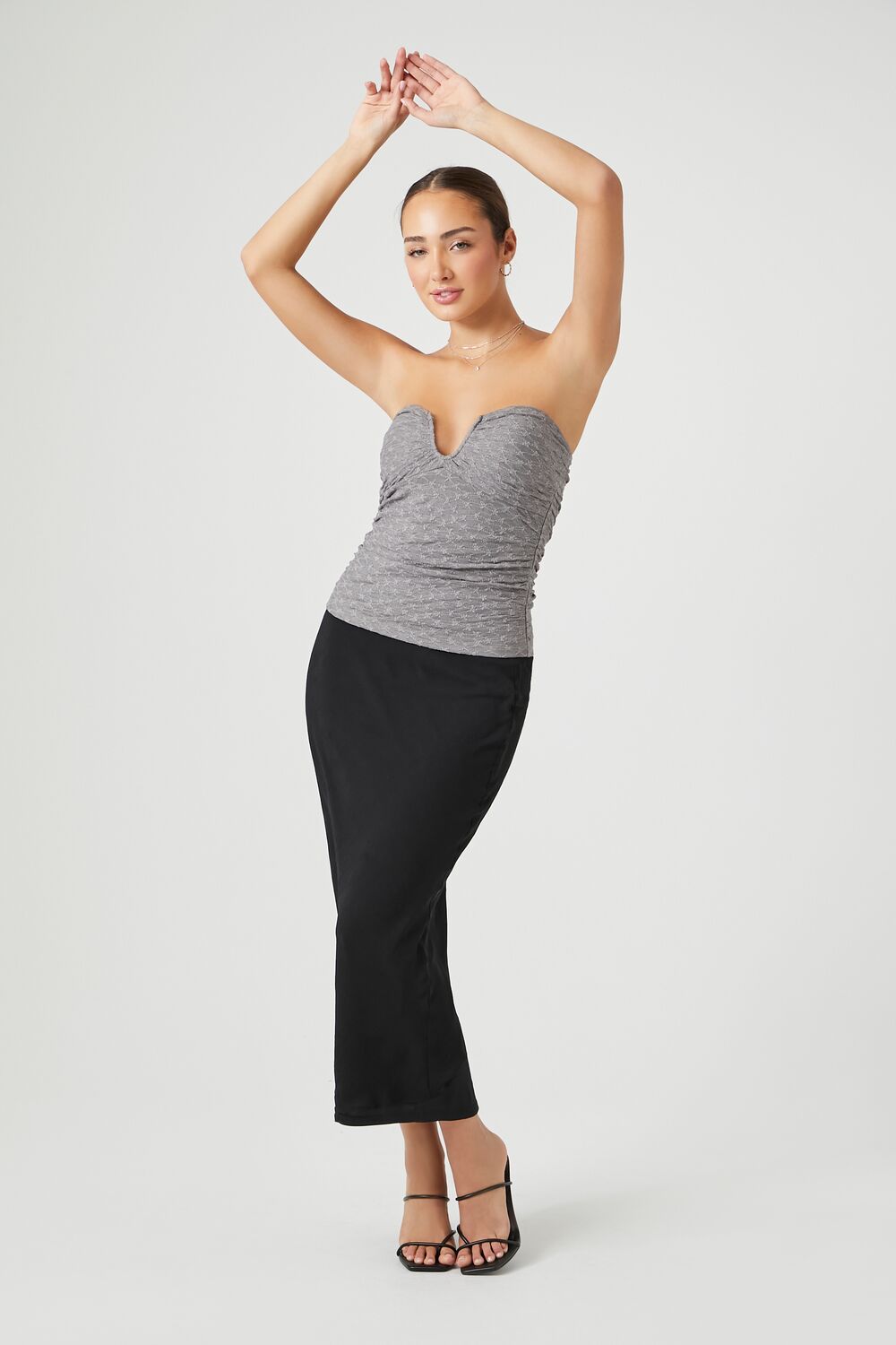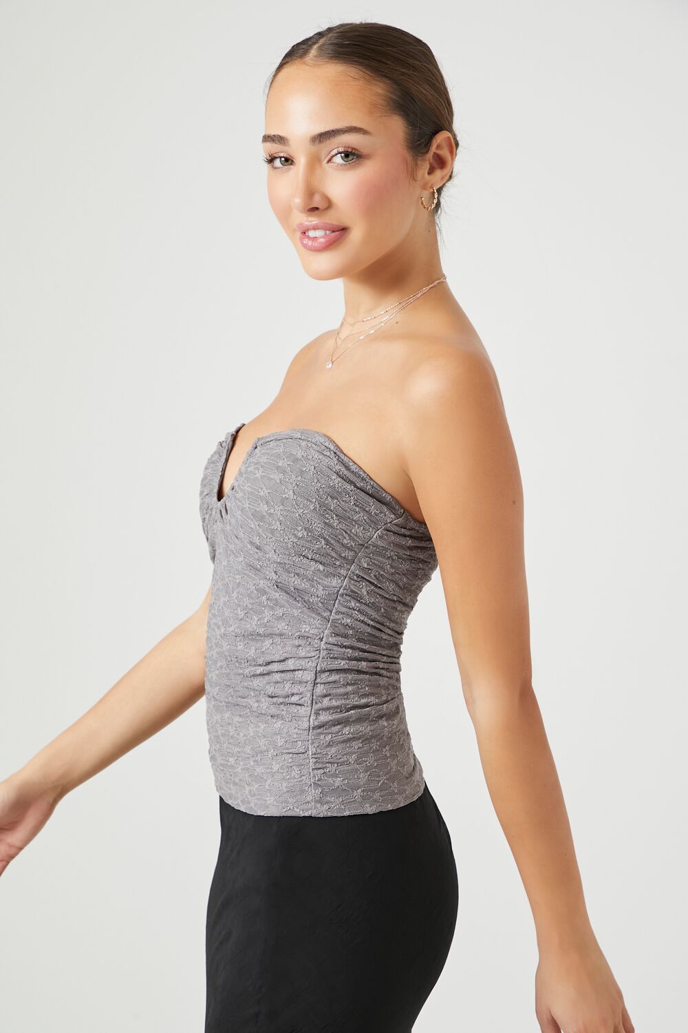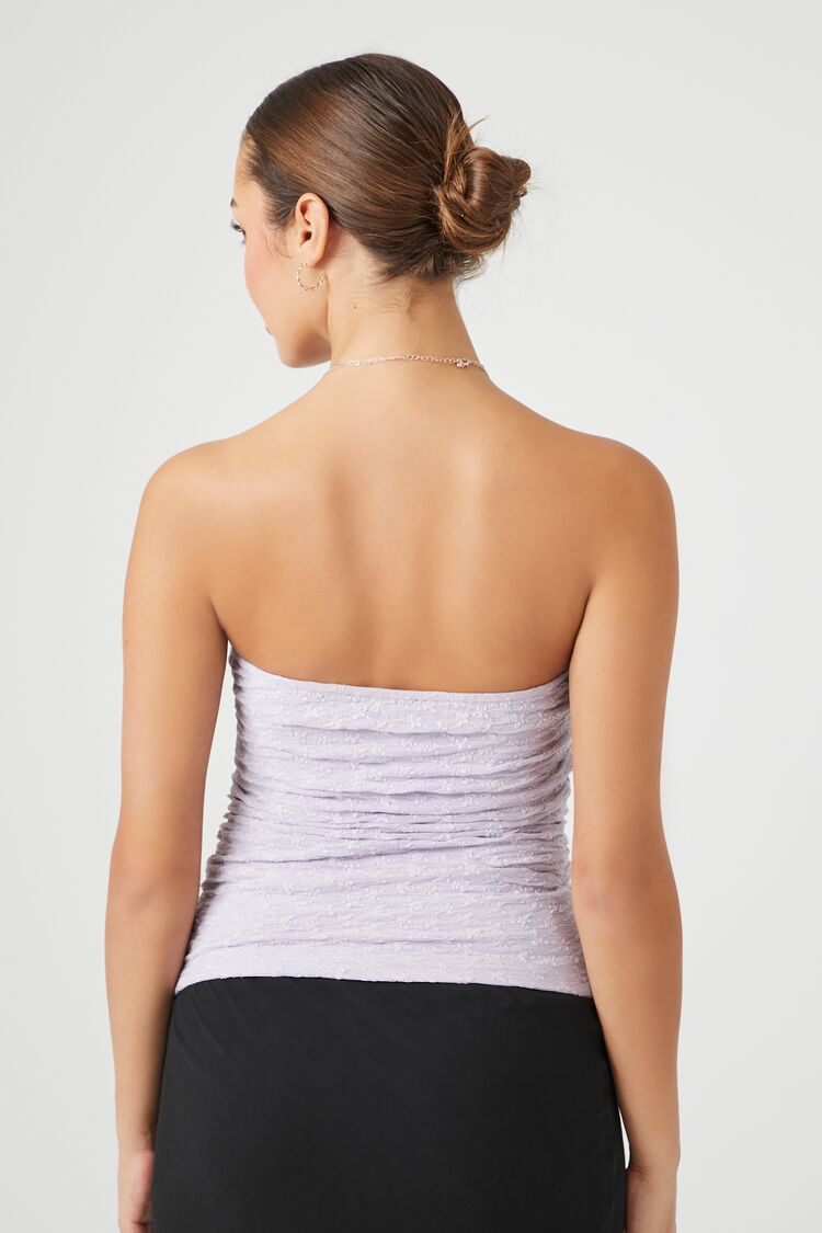 A knit tube top featuring a V-wire sweetheart neckline. straight-cut back. and an allover textured construction.