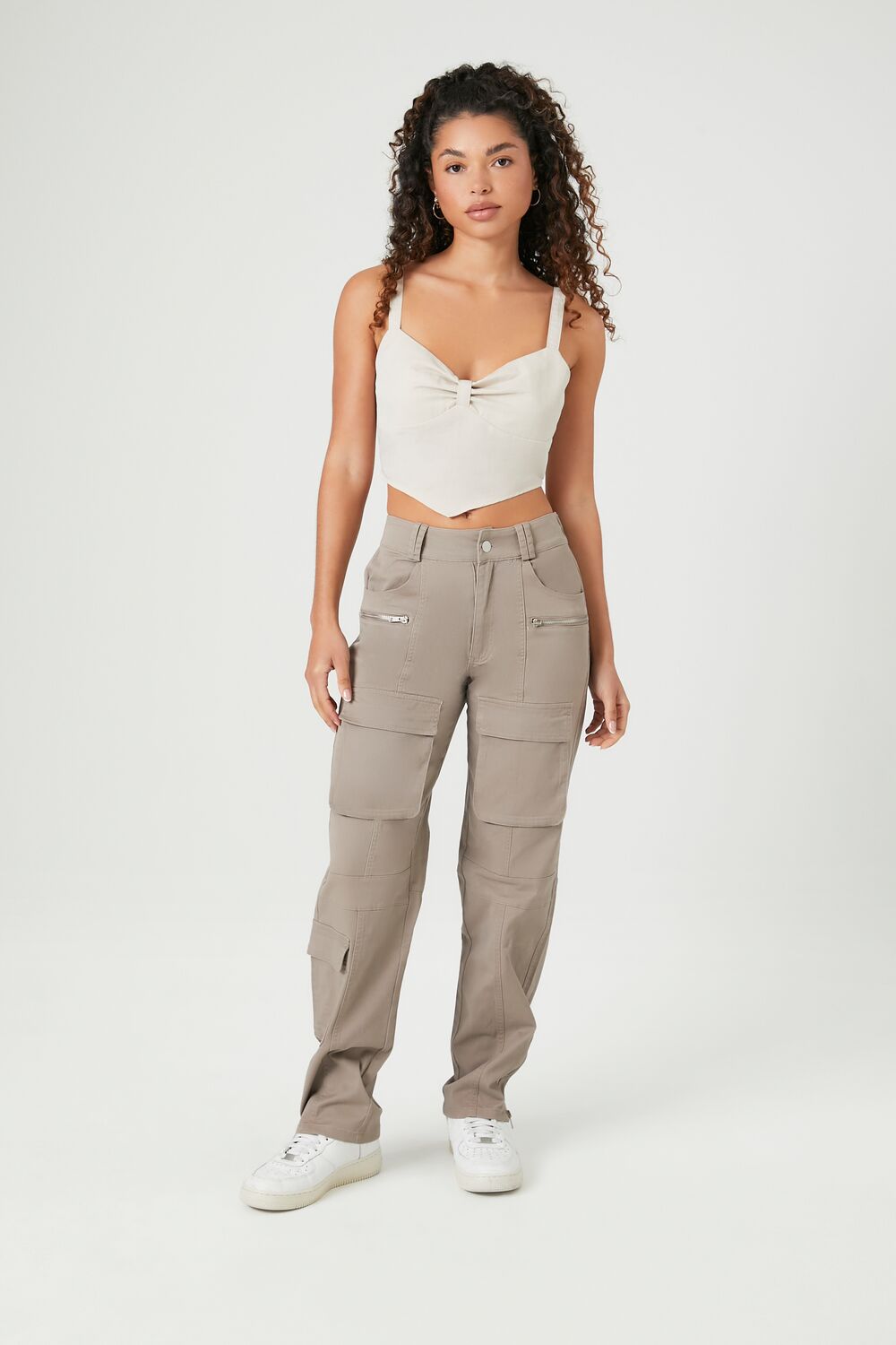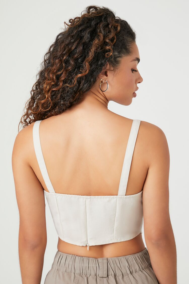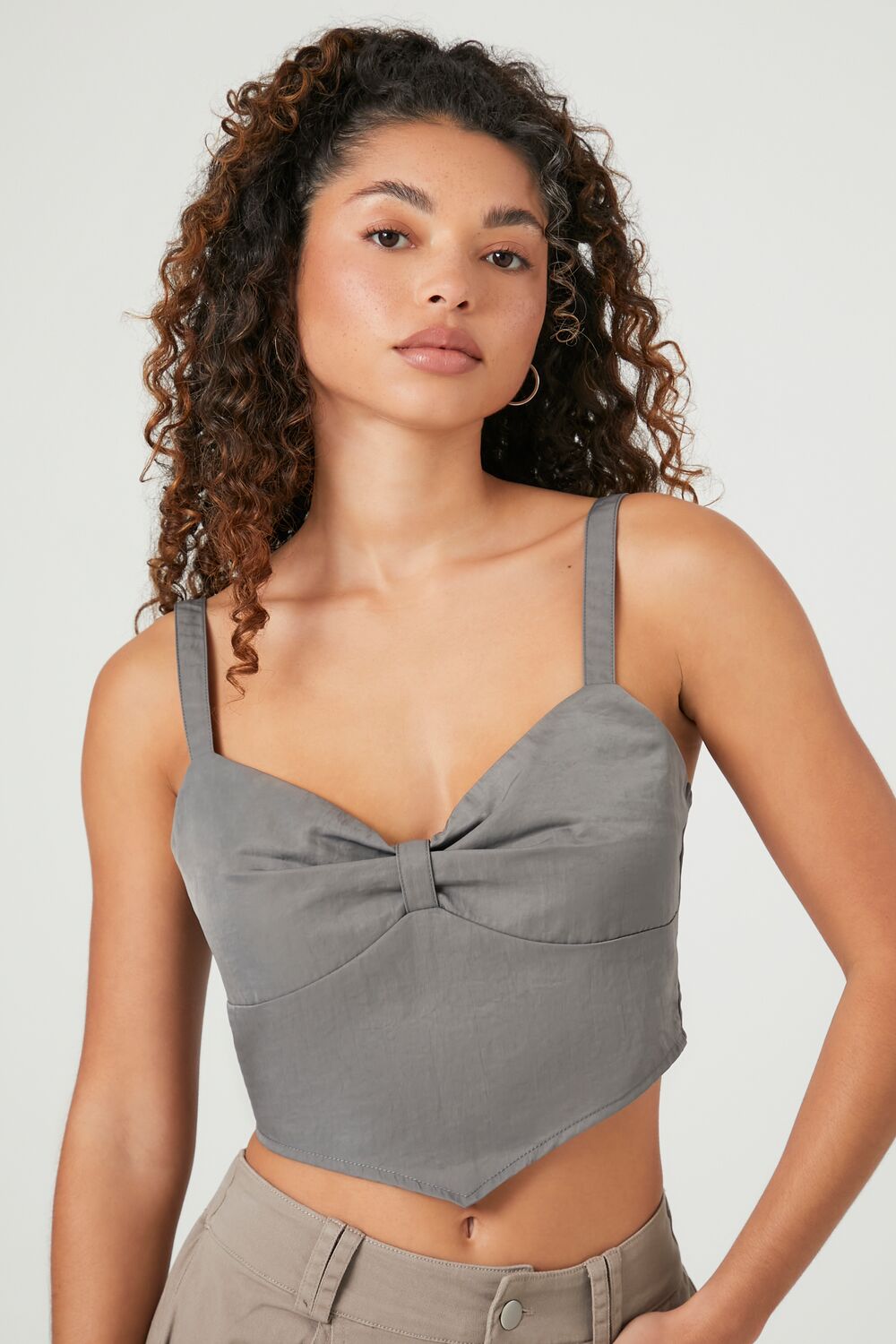 A woven crop top featuring a sweetheart neckline. shoulder straps. square-cut back. front V-hem. and a concealed back zipper.