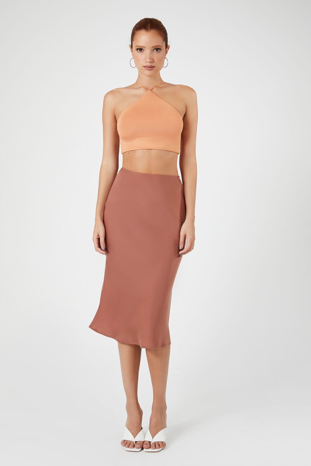 A knit cropped cami featuring a V-strap neckline. cord straps. and a fitted silhouette.