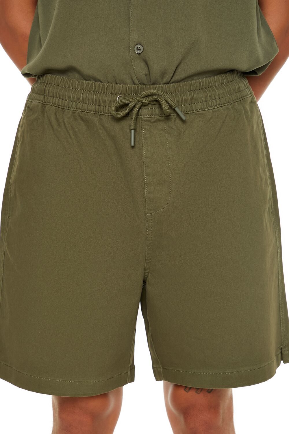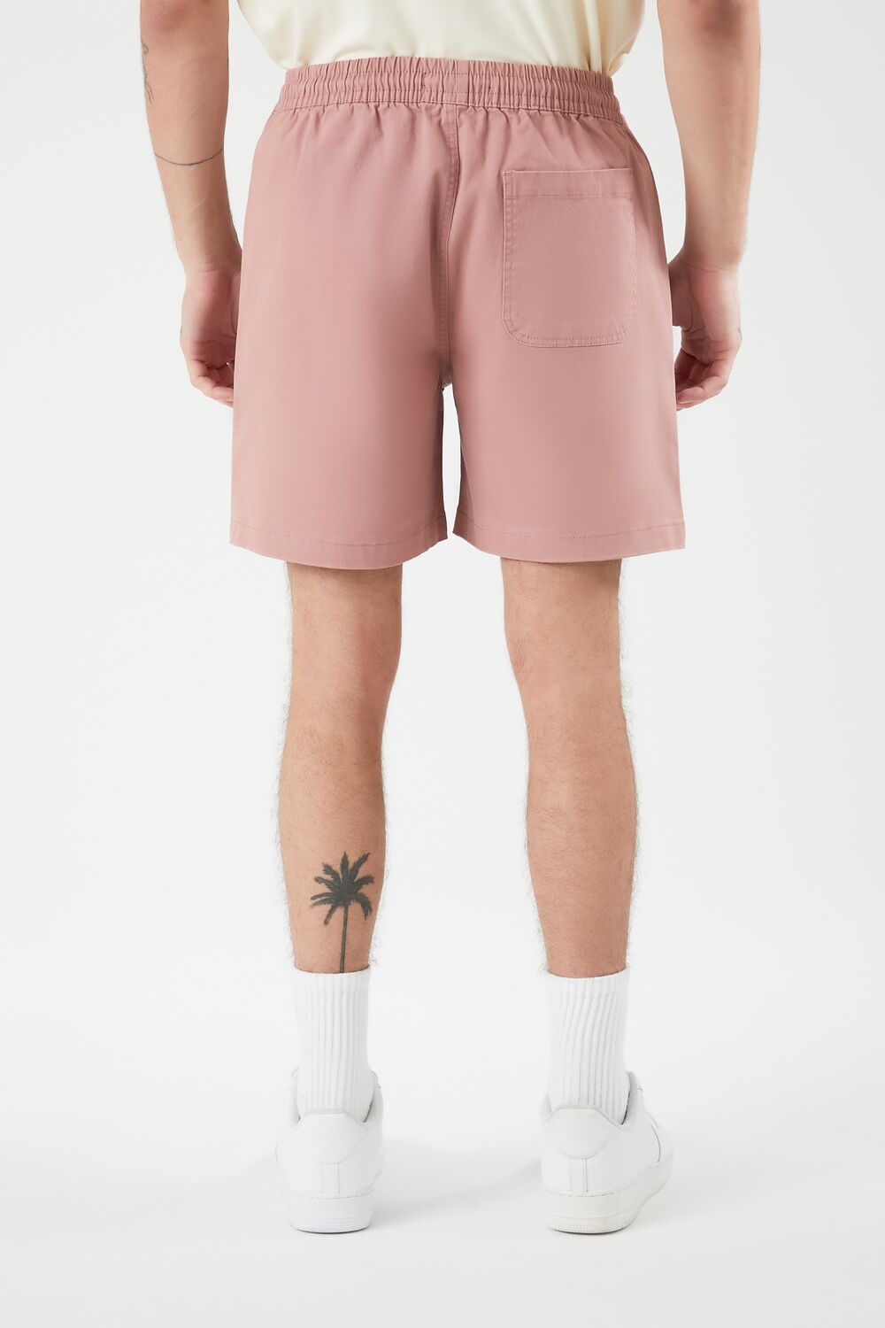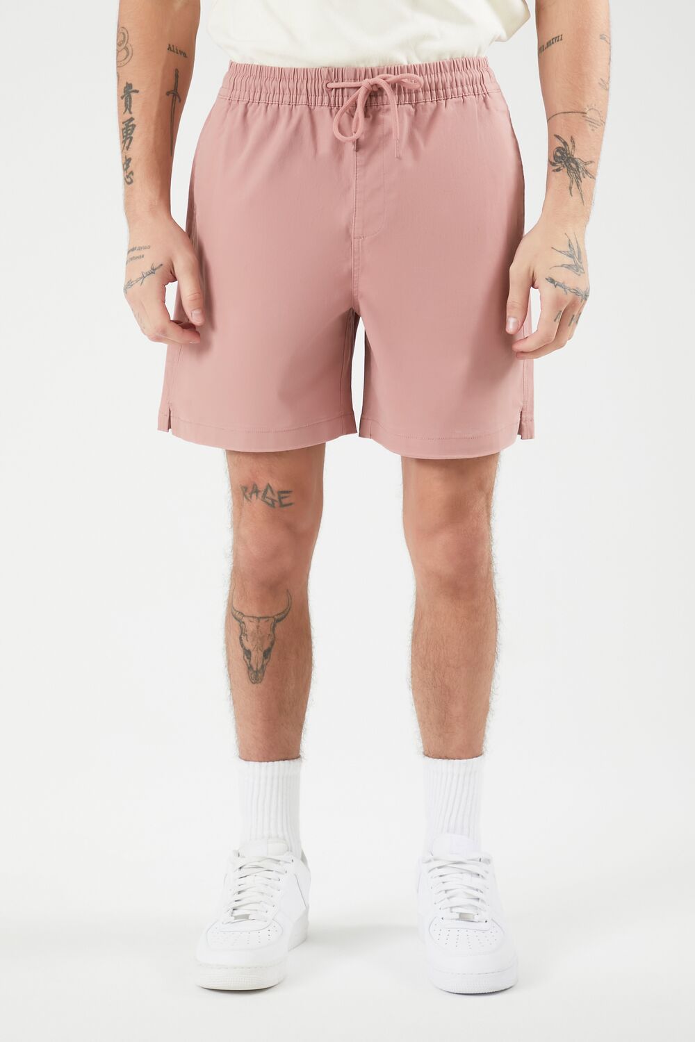 A pair of woven shorts featuring a drawstring waist. mock zip fly. slanted front and back jetted pockets. and vented hem.