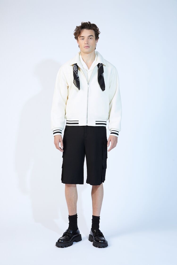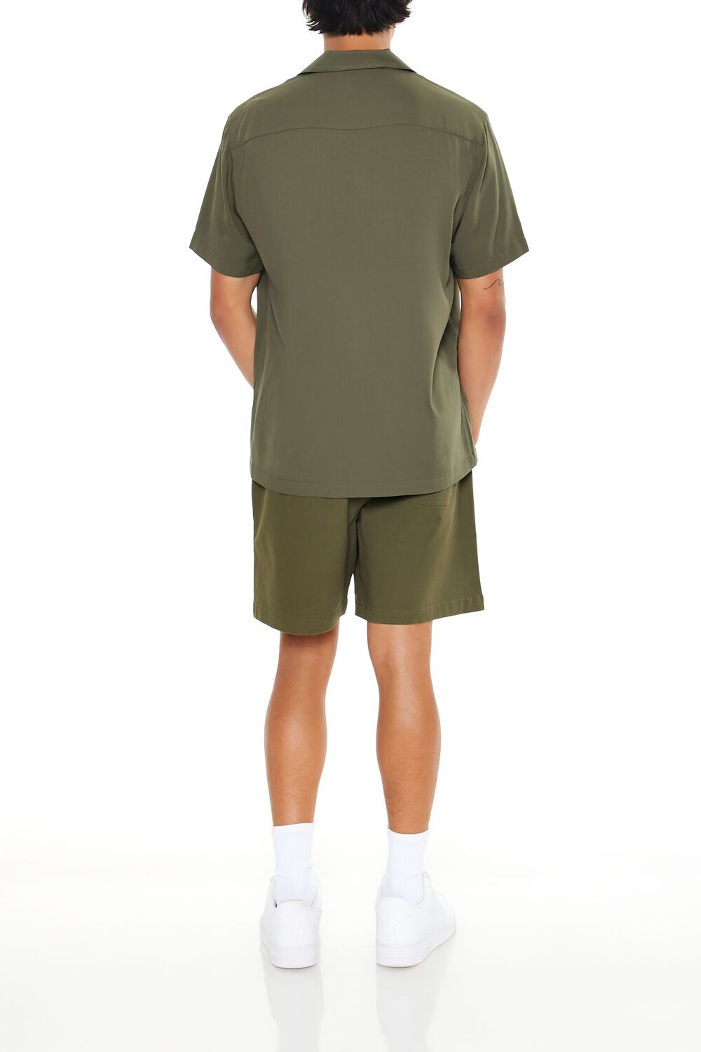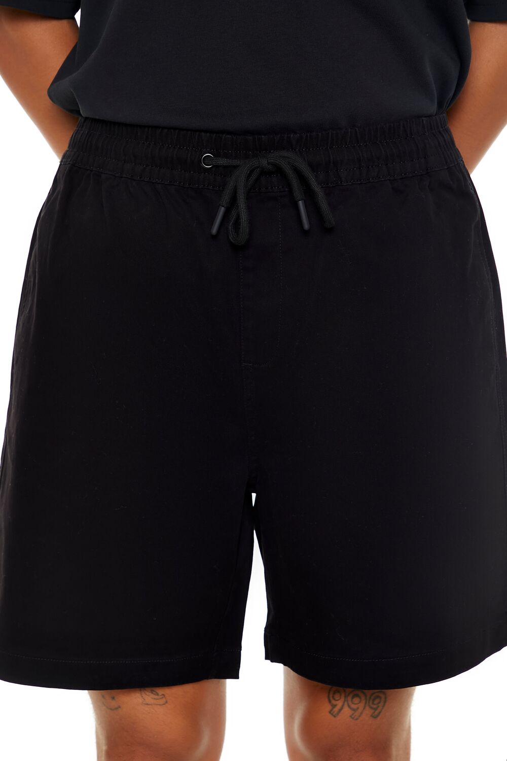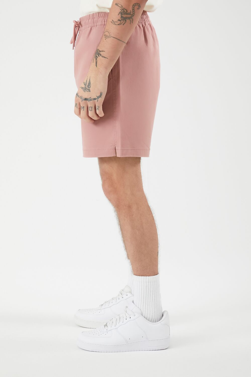 A pair of woven shorts featuring a drawstring waist. mock zip fly. slanted front and back jetted pockets. and vented hem.